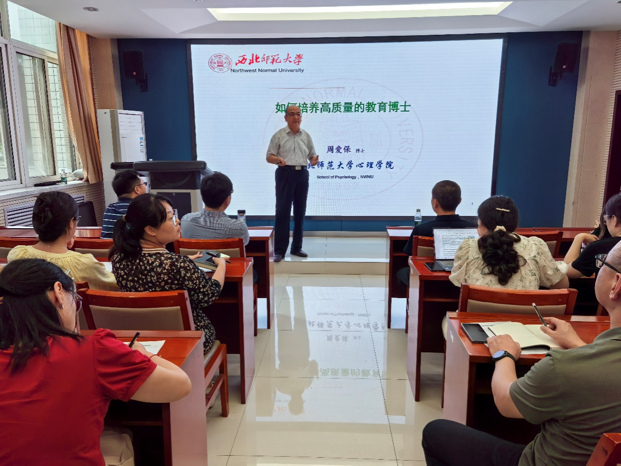 7月11日下午,“八秩荣光•强师报国”心理学名家系列学术讲座第二十期在公司雁塔校区教学九楼9209学术报告厅开讲。西北师范大学学科带头人、甘肃省行为与心理健康重点实验室主任周爱保教授应邀做了主题为“如何培养高质量的教育博士”的学术讲座。sunbet师生到场聆听,讲座由姬鸣教授主持,共100余名师生参与了本次讲座,现场气氛热烈,学术氛围浓厚。